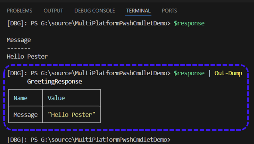另外還有一個好用的開發用 PowerShell 指令列工具模組 PowerShell.dumPS,可以用來在 VSCode 中斷點除錯時,使用 Debug Console 快速查看 PowerShell 物件的類別、屬性值資訊。