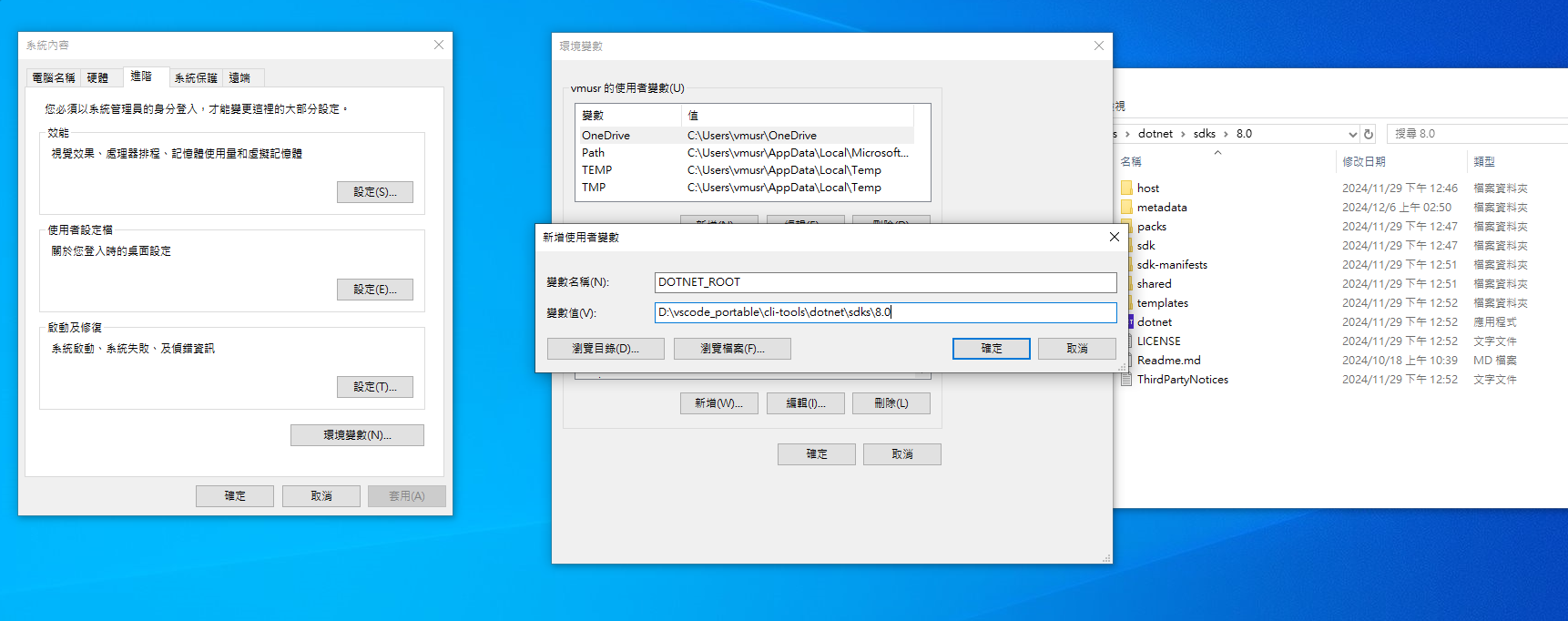 除了要手動開啟Windows『開發者模式』設定以及將同捆的 .NET SDK 的執行檔路徑到環境變數之外,其他的都是使用 Portable 版本的開發環境:
