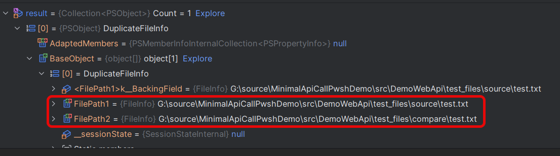 原本在 PowrShell script 裡用的是 PowerShell 定義自訂 Class 類別,因此在執行完畢回傳的結果值物件直接使用 dynamic keyword 寫法簡化取得 FilePath1 & FilePath2 屬性值程式碼。