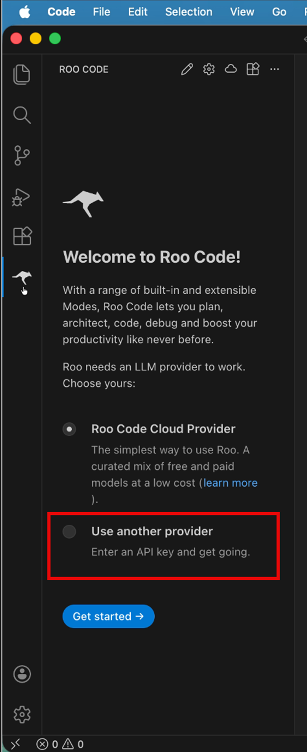 Roo Code 擴充套件第一次打開時,會顯示如下畫面,選擇 Use another provider:
