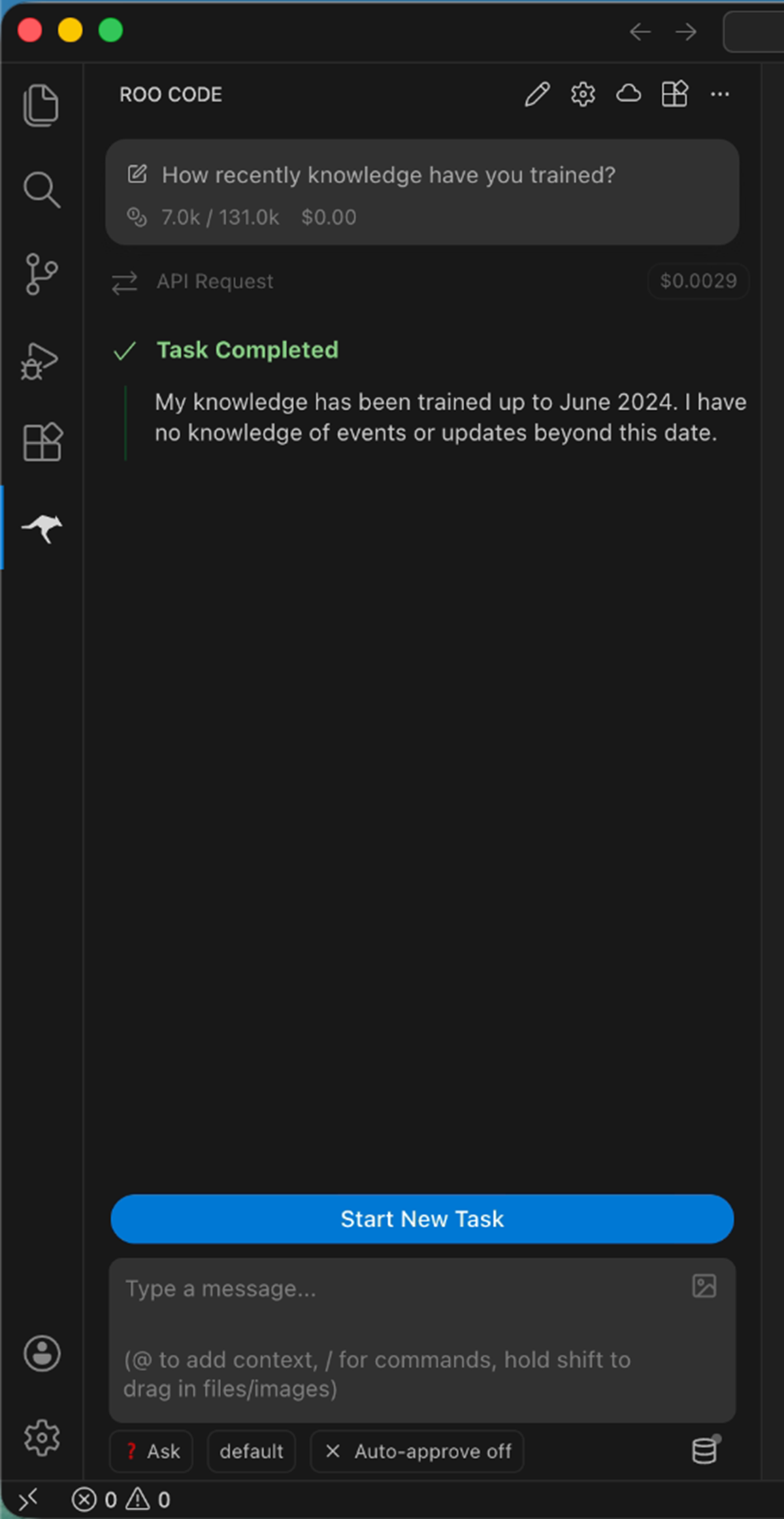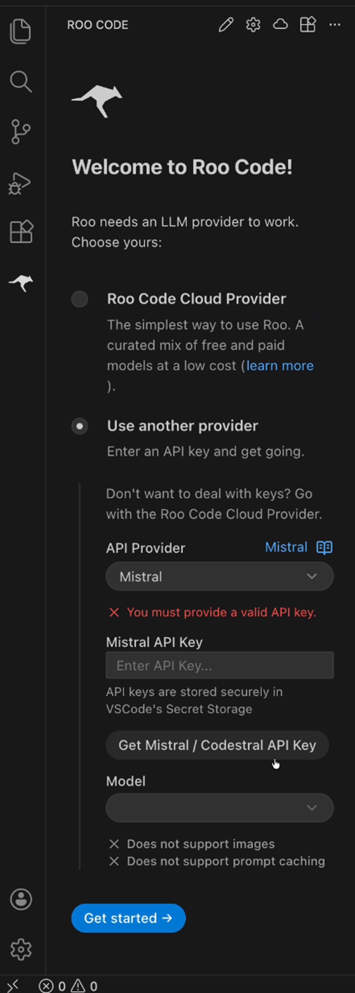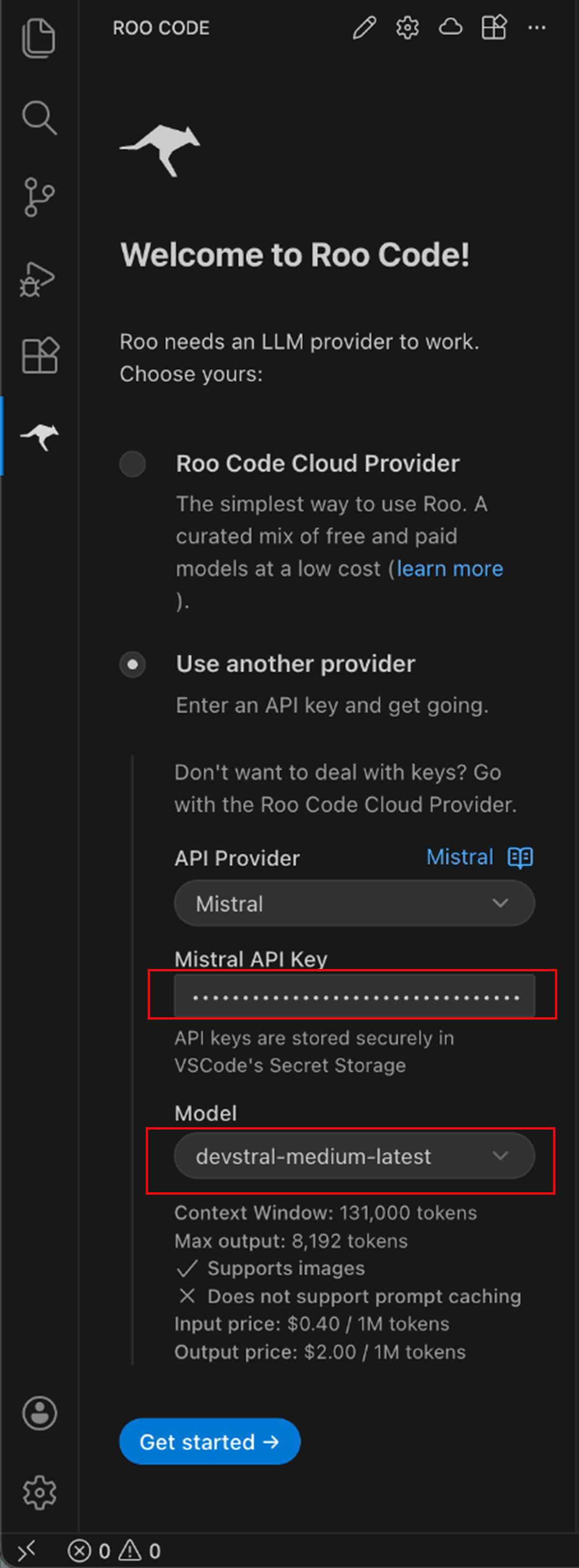 按下方的 Get started 按鈕,即可完成 Roo Code 擴充套件的 Minstral AI API Key 設定,然後應該就可以開始使用文字談話介面的功能開始互動: