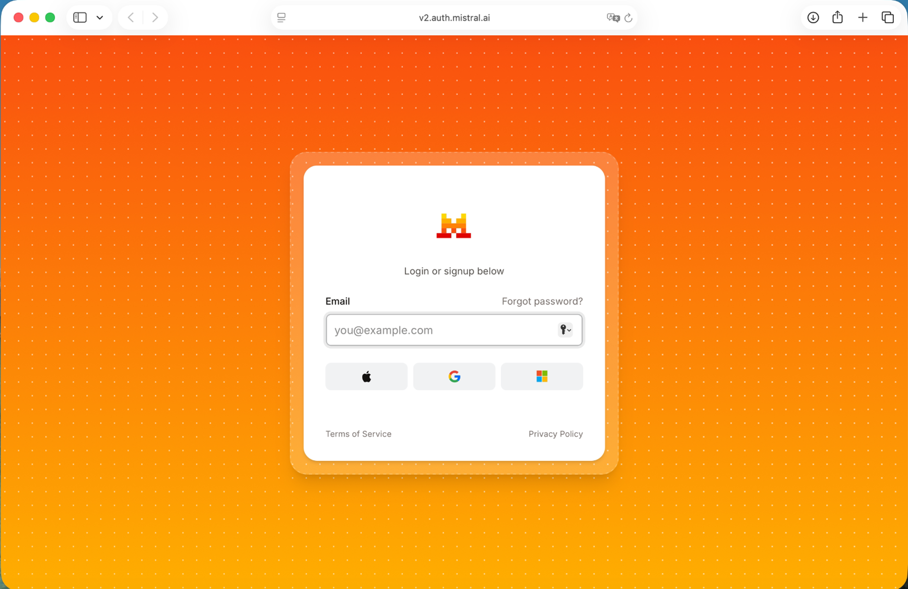 會開啟瀏覽器前往 Minstral AI 網站(https://console.mistral.ai/),可使用幾種流行的 OAuth 認證來註冊帳號:
