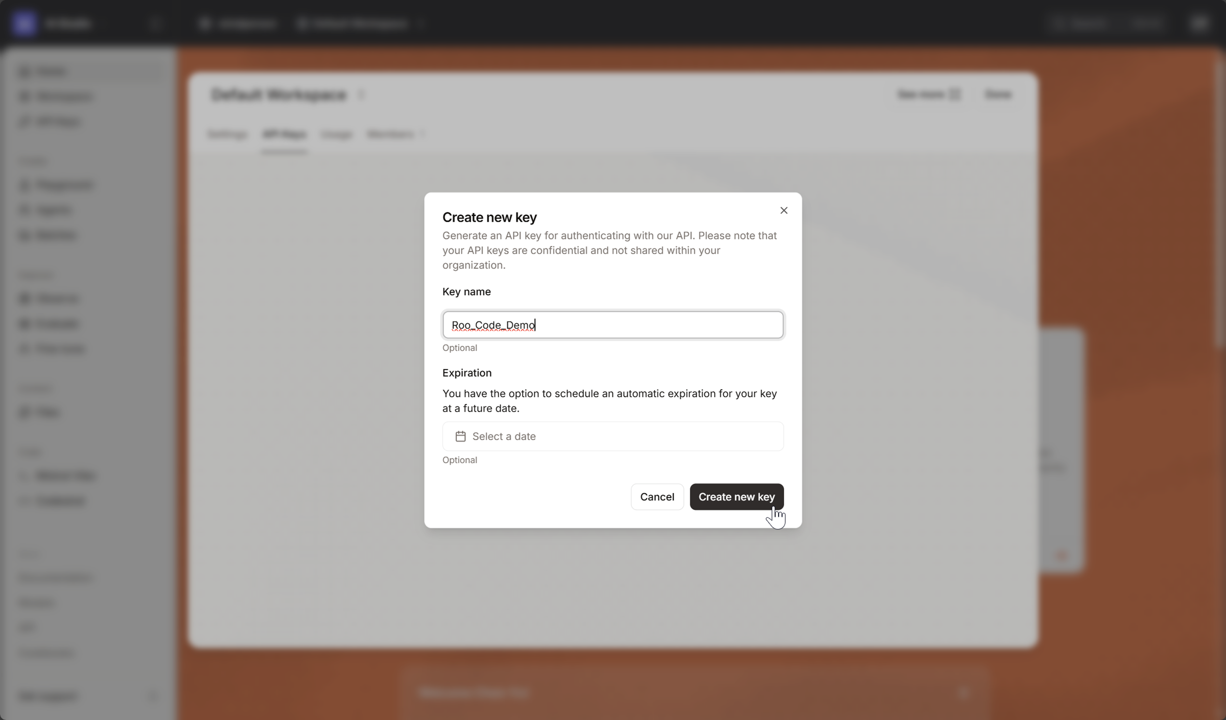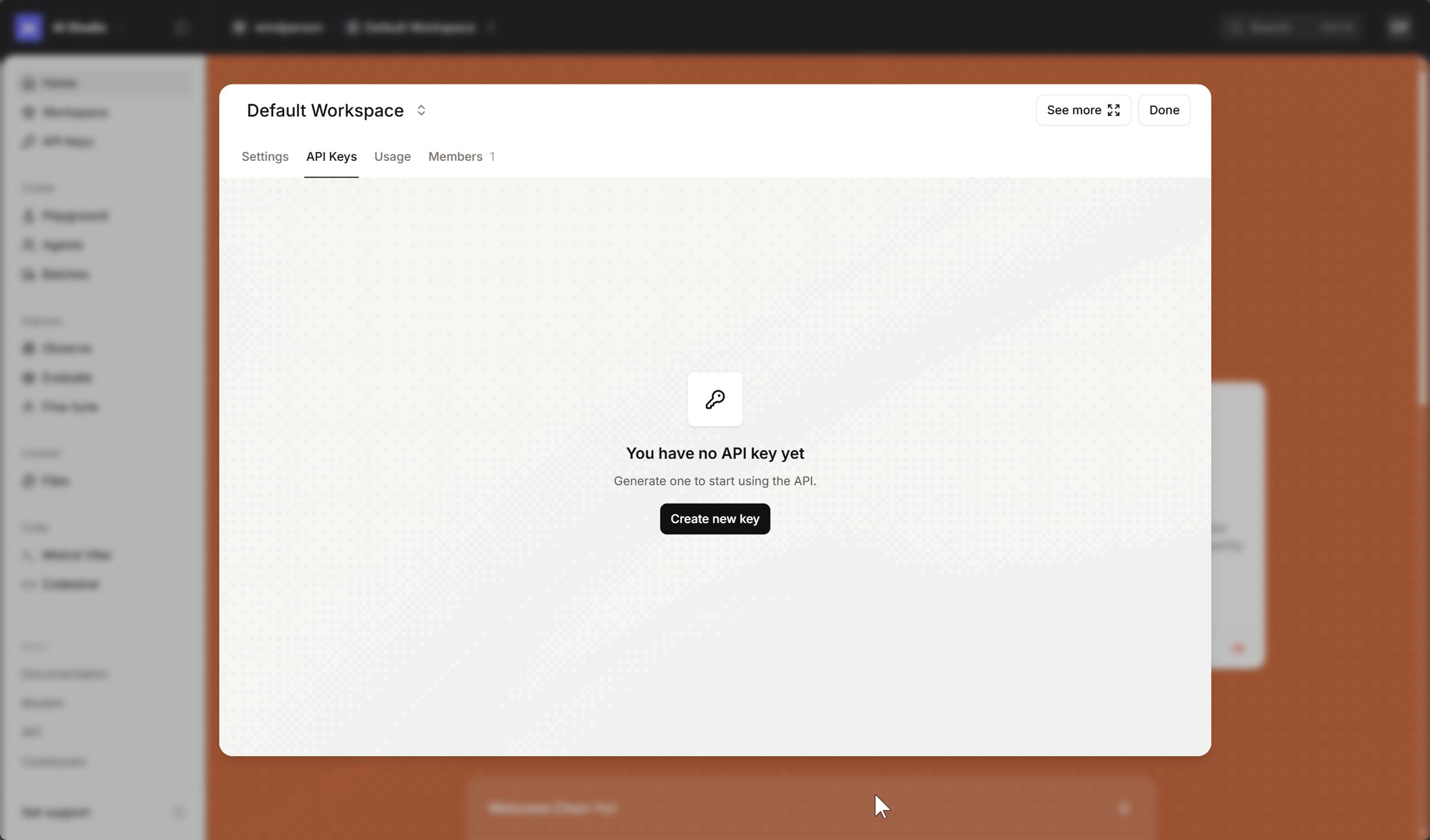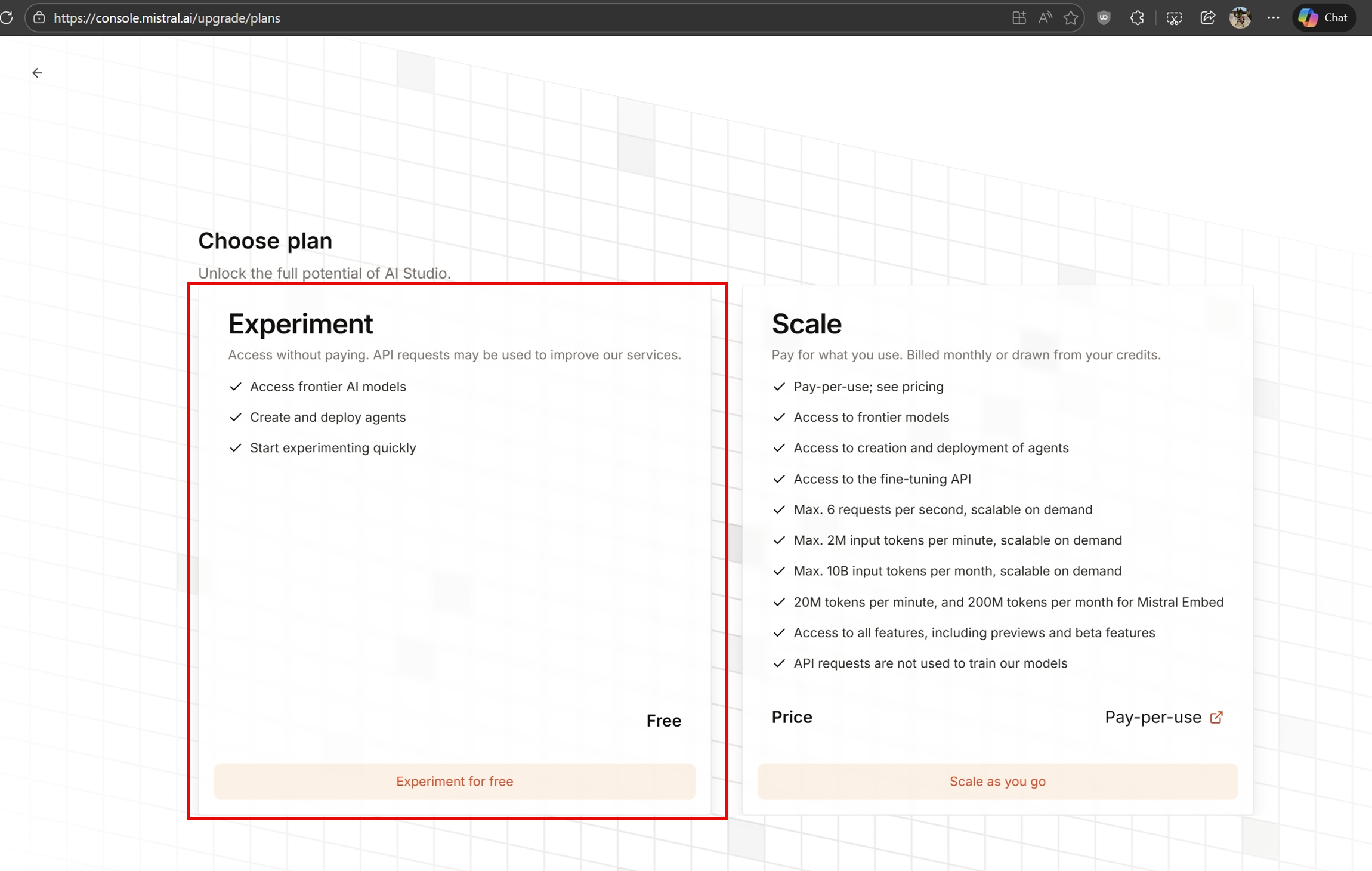註冊完成並登入後,選擇左上第三個 API Keys https://console.mistral.ai/home?workspace_dialog=apiKeys 可建立 API Key: