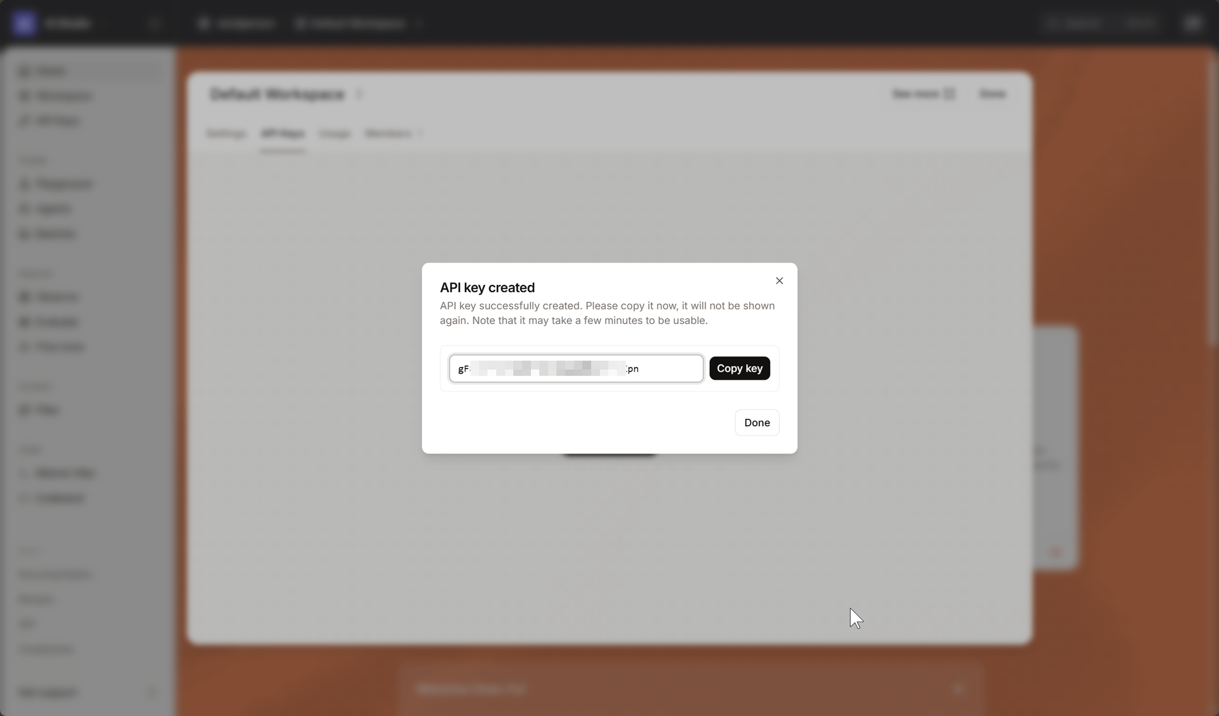 建立完成時會顯示 API Key,記得一定要按 Copy key 複製起來存在安全的地方,否則之後就看不到完整的API Key內容了: